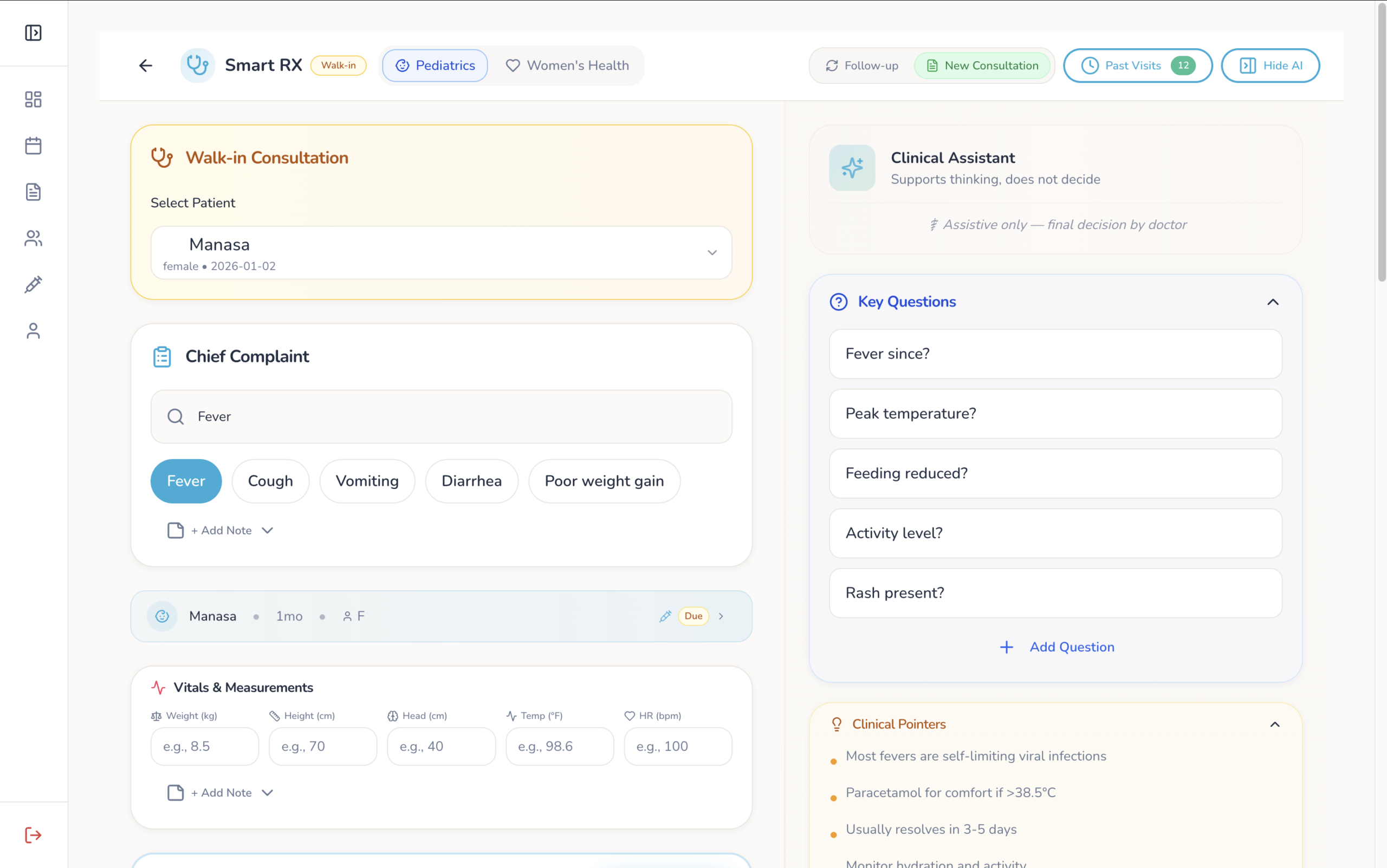 Specialty-specific SmartRx layers designed for Pediatrics, Gynaecology and Obstetrics, enabling accurate prescriptions, clinical decision support, and faster consultations.